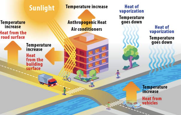 As this heatwave significantly impacted the Midwest and East Coast of the United States, there’s a pattern that major cities experienced more extreme high temperatures compared to suburban and rural areas. Densely populated cities create the “urban heat island effect.” According to the Government of New York City, these islands are formed when “natural surfaces that were once permeable are paved with asphalt or covered by buildings and other structures.” These surfaces absorb radiation from the sun during the day and are re-radiated during the night, raising ambient temperatures. Additionally, waste heat from air conditioners and increasing greenhouse gas concentrations lead to global warming. After all, climate change is caused by human activity.
