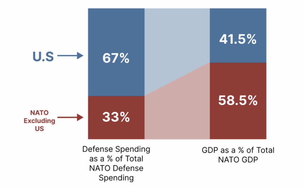 Currently, US defense spending accounts for more than 67% of the total NATO defense spending. While this is a decline from the 73% of defense spending the U.S. accounted for in 2015, it is still more than the approximately 41.5% of the total GDP of NATO that the U.S. accounts for. This comes across as especially unbalanced when considering the increased risk European countries are at from foreign enemies due to their close proximity.