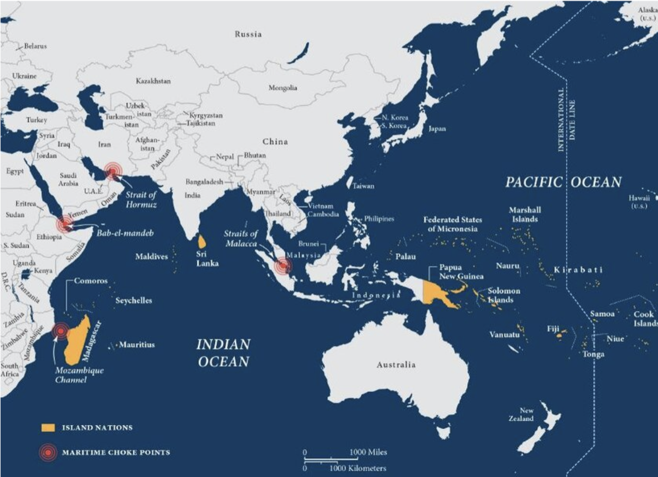 Map of the Indo-Pacific highlighting key maritime choke points and strategically important island nations. (Source: Indonesian Encyclopedia Yizuo Academy)