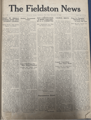 The first edition of The Fieldston News, from November, 1928, the year Fieldston opened its Riverdale Campus. That year, The Fieldston News replaced the school’s previous student publication, “The Ethical Light,” becoming Fieldston’s official newspaper. Source: Sophia Ahmed