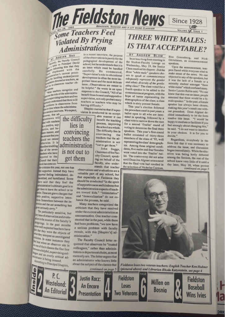 A 1993 edition of The Fieldston News, featuring an article by Andrew Blum. Source: Sophia Ahmed