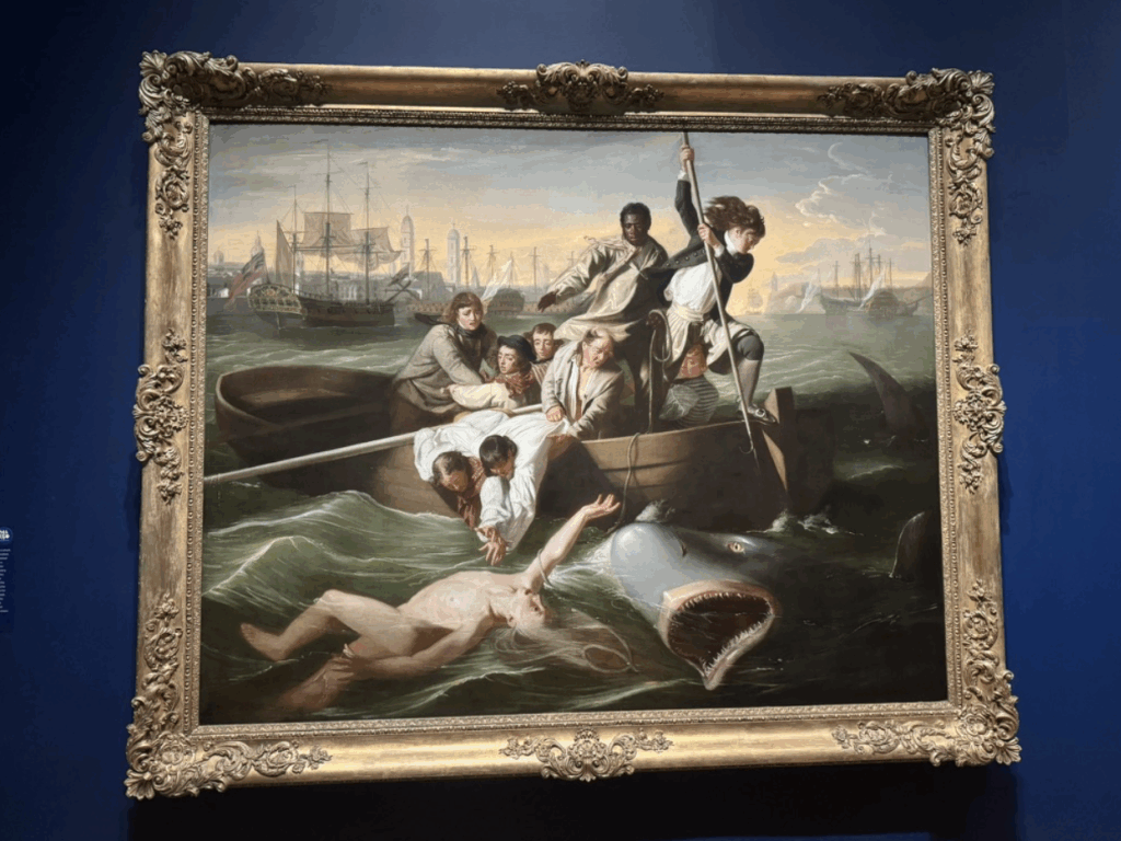 How might a man of African descent come to serve aboard a British ship in a Spanish colony where the slave trade flourished? This question reverberates through John Singleton Copley’s “Watson and the Shark.” The oil painting portrays the true 1749 incident in which a shark attacked a fourteen-year-old cabin boy named Brook Watson in Havana Harbor. Watson—who survived but lost a leg—went on to become a prominent statesman and commissioned Copley to depict the ordeal decades later.
