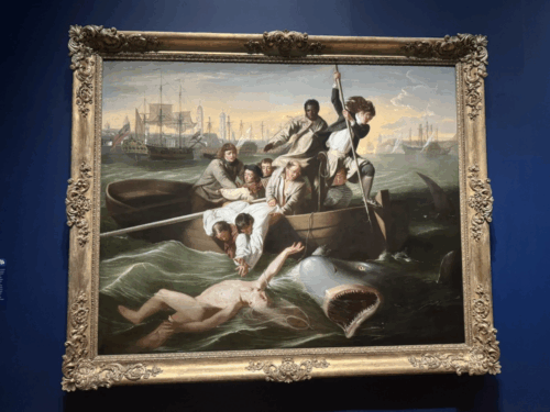 Copley modeled Watson’s figure on the statue of the Borghese Gladiator, aligning with neoclassical aesthetics commonly found in 18th-century art. Curiously, the painter had never seen a shark. His anatomically incorrect rendering—with forward-facing eyes, nostrils emitting air and oddly anthropoid lips—was likely based on second-hand descriptions. The harpoon, pointed at the beast’s maw, could function as an instrument of rescue or an assertion of mastery over nature and the alleged primitive.