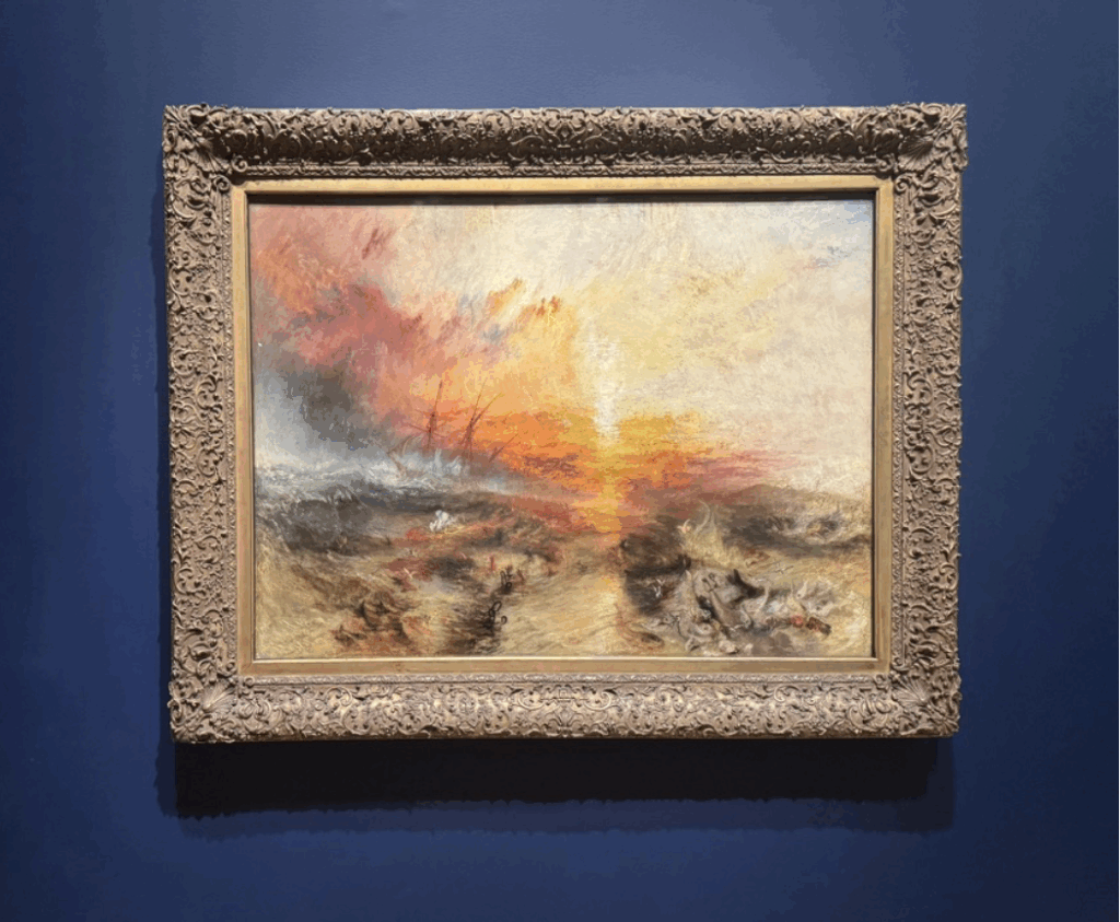 Painted as an indictment of the slave trade, Turner recalls the 1781 Zong Massacre, when the captain of the British slave ship Zong ordered more than 130 sick enslaved Africans to be thrown overboard so their deaths could be claimed as insurance losses.