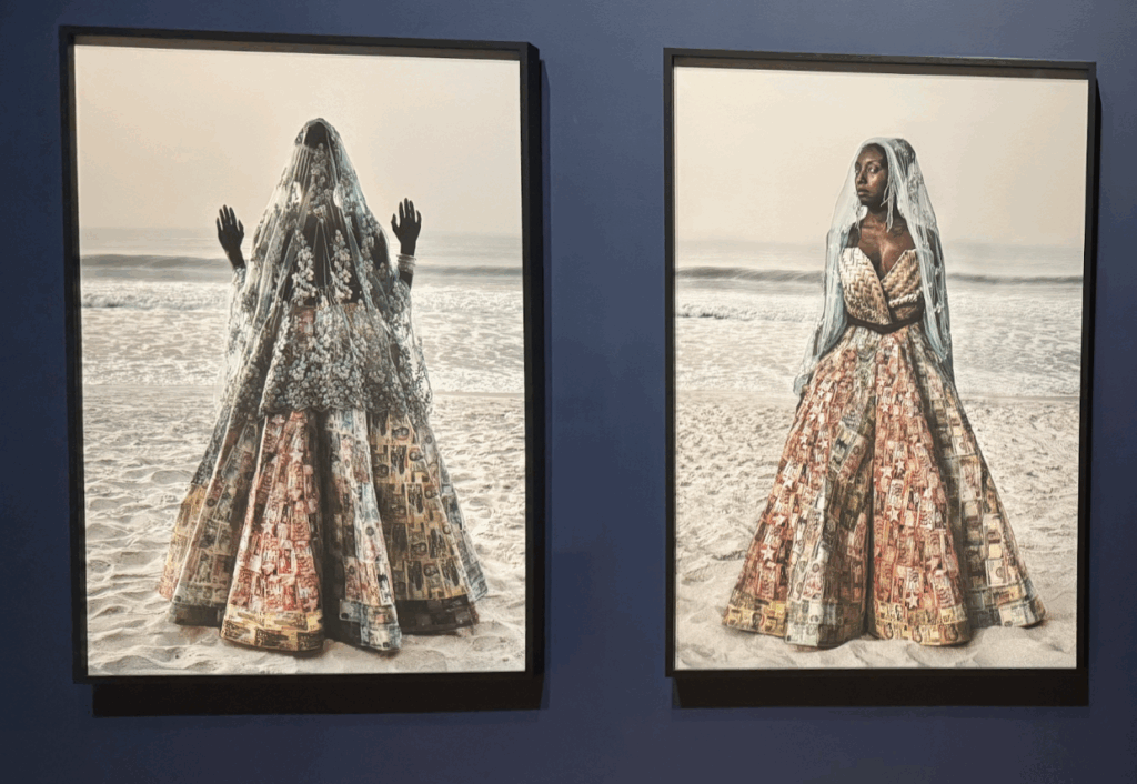 Adjacent hangs “Some People Have Spiritual Eyes,” a two-part self-portrait by Ayana V. Jackson. The artist’s dress, structurally reminiscent of the Victorian era and composed of Ghanaian cedi notes stitched together, represents how imperialist greed commodified human beings. She presents herself as a citizen of Drexciya, an imaginary Afrofuturist underwater kingdom populated by the children of pregnant women who passed away during the Middle Passage.