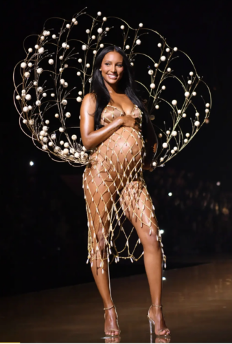 As the lights dimmed and the music softened, the audience got ready for the show to begin. A single silhouette appeared center stage, and as she began to walk to Mariah Carey’s “Close My Eyes,” a warm yellow glow revealed her oyster-shaped wings. Walking closer to the edge of the runway, Jasmine Tookes emerged from the shadows, and with that, she announced her nine-month pregnancy. Her outfit portrayed her as a “mother oyster,” a genius play on her pregnancy, with her bump standing in for an oyster’s pearl. This opener was breathtaking and served a powerful purpose, glorifying womanhood and new life. Her outfit was a personal favorite of mine. This opener set the tone for the rest of the show, reminding everyone that it wasn’t just about fashion but about its models as well.